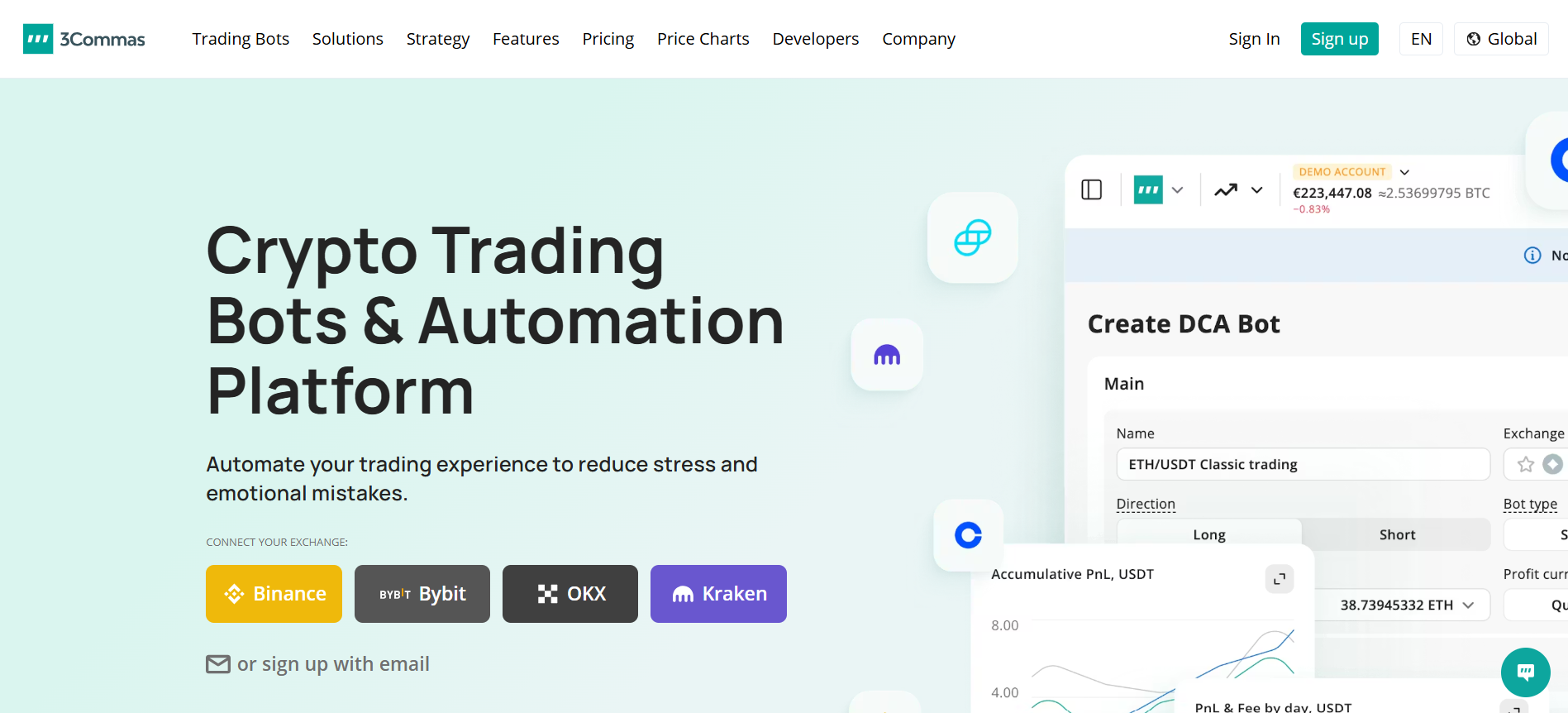 3Commas gained recognition for its SmartTrade terminal, which offers order types that many native exchanges lack. The platform runs automated strategies on existing exchange accounts, whether you're executing simple DCA accumulation or complex multi-pair strategies.