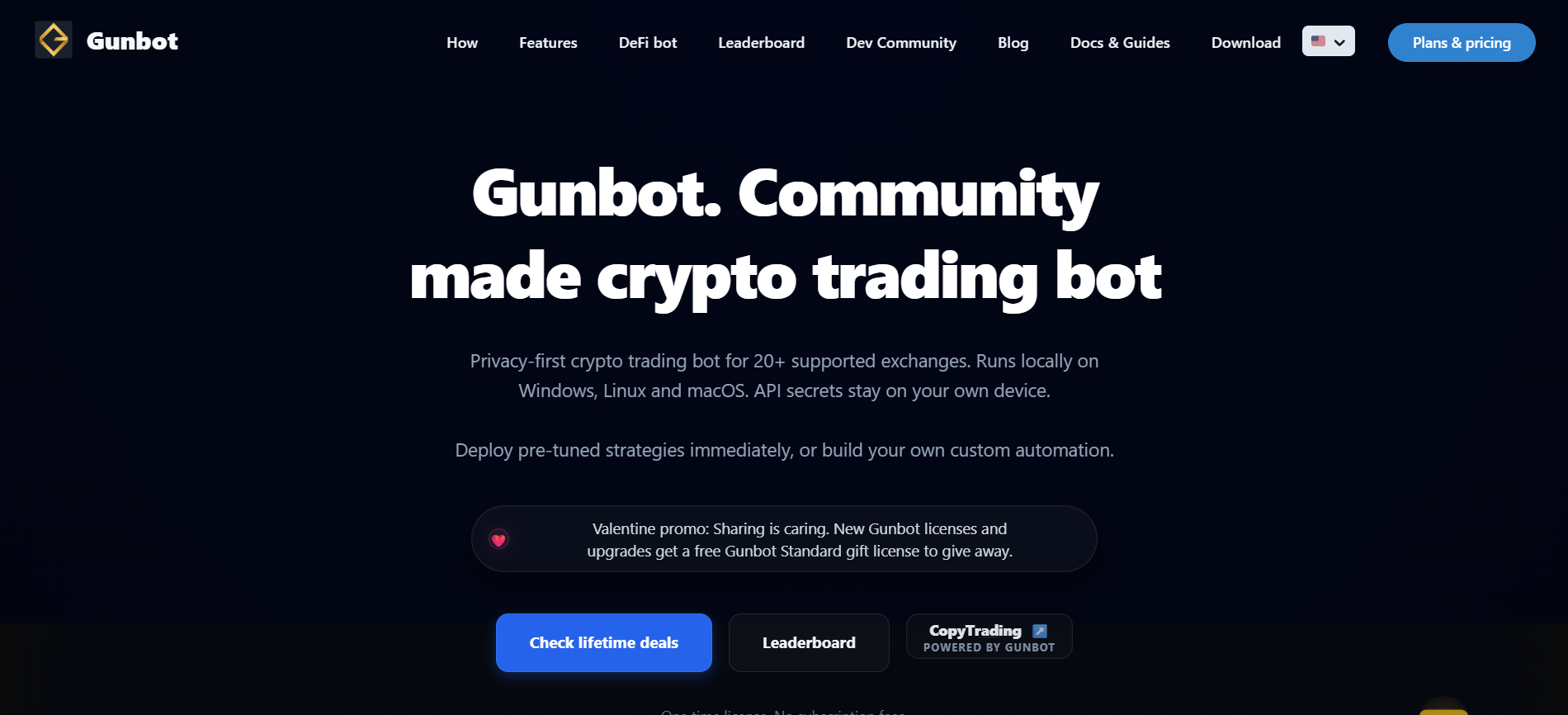 Gunbot operates as a self-hosted crypto trading bot for experienced users seeking complete control and privacy. The application runs on your computer or a Virtual Private Server, giving you ownership of both the software and the data. The platform has expanded to support DeFi exchanges and decentralized automated market makers, making it unique among mainstream options. Telegram integration enables remote live monitoring, bot control, and performance tracking.